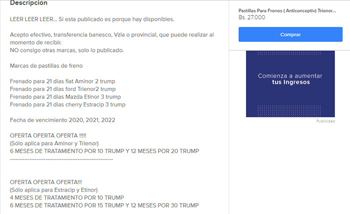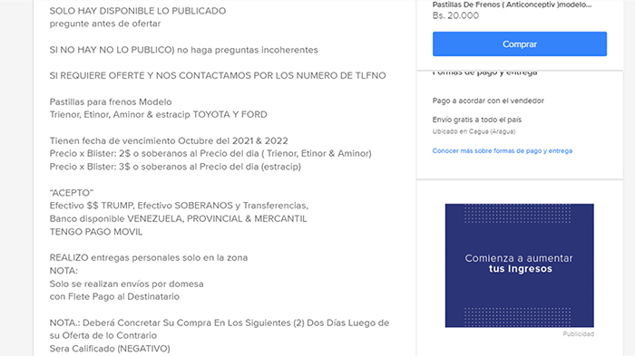En Mercado Libre, dichas marcas se publican bajo el anuncio de “pastillas para frenos” y su valor puede variar entre 2 y 3 dólares, si se necesita el tratamiento de 21 días; y 10 o 20 dólares si se adquiere una promoción de seis o 12 meses.