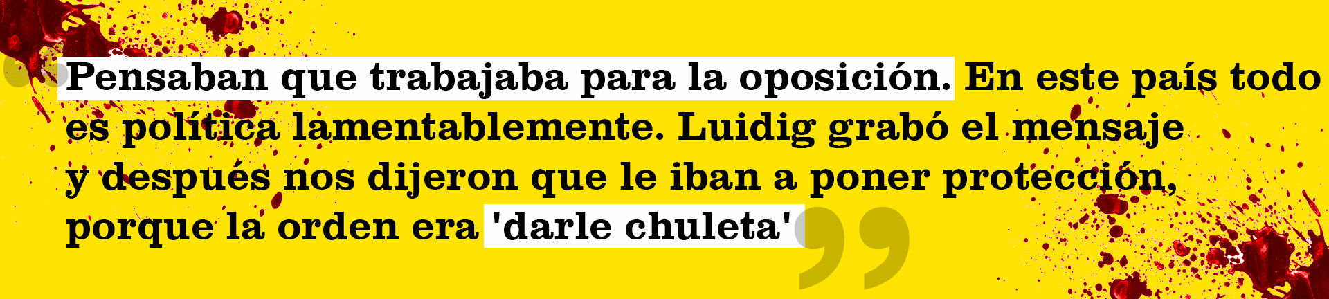 Después de ese día, comenzó el calvario para Ochoa y Dignamor. También para «Rosita» que ya era la novia oficial de Luidig. «Señora, no se asuste», le dejó claro el diputado cuando se despidieron de aquella reunión. «Claro que estábamos asustados, después me lo mataron, el ocho de agosto del 2014». Confundida por el crimen, desesperada e inconsolable, no entendía por qué había pasado. Aunque estaba clara de las múltiples amenazas que recibió primogénito. «Desconfié de Jimena. Llegué a pensar que estaba involucrada en su muerte. Pero después le pedí disculpas. Era un momento difícil para mí».