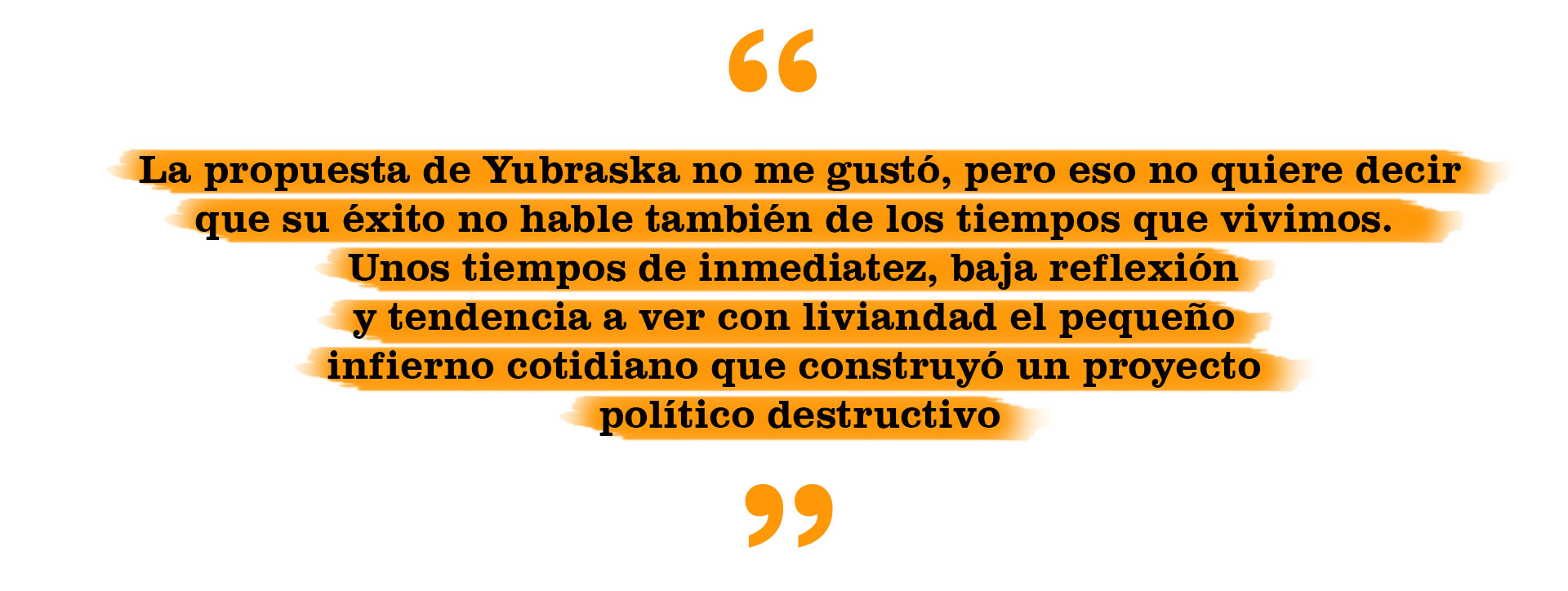 “La política y los contenidos dramatizables llevan hace un buen tiempo una estable amistad, pero hay que moverse con tino para que no parezcan paródicos insensibles, sino paródicos empáticos. Desde el principio, la propuesta de Yubraska no me gustó, pero eso no quiere decir que su éxito no hable también de los tiempos que vivimos. Unos tiempos de inmediatez, baja reflexión y tendencia a ver con liviandad el pequeño infierno cotidiano que construyó un proyecto político destructivo de la humanidad y constructivo para las mafias y los rapiñeros”, desliza Joaquín Ortega.