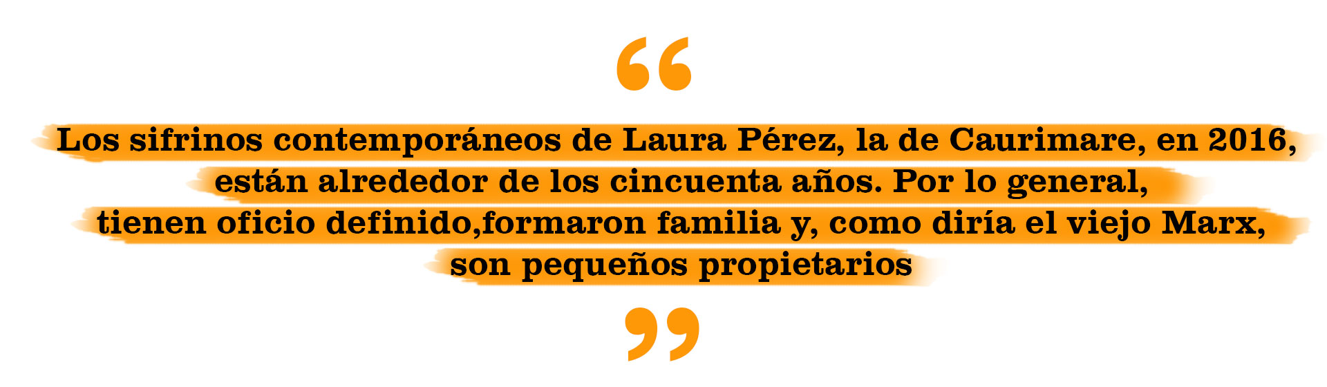“Los sifrinos contemporáneos de Laura Pérez, la de Caurimare, en 2016, están alrededor de los cincuenta años. Por lo general, tienen oficio definido, formaron familia y, como diría el viejo Marx, son pequeños propietarios; al menos de un apartamento y un automóvil”, esquematiza el sicólogo social Leoncio Barrios acerca de aquellos trotamundos ahora claustrofóbicos. “Como Laura, tuvieron oportunidad de viajar al exterior, sobre todo a Miami donde era barato y compraban de a dos; quizás cruzaron el charco en viaje de 15 años o de graduación. Rumbearon en Las Mercedes y el mirador de La Alameda, tomaron birras en el café de Rajatabla, bailaron disc music en West, Hollywood o L’Antro y salsa en el Maní. Disfrutaron de Caracas, la vivían. Muchos de ellos ya no la reconocen por el tiempo que llevan afuera. Se hicieron extranjeros. Otros, aquí siguen, echándole pierna para poder sobrevivir, añorando la ciudad en la que se podía salir a rumbear, tomar el Metro con tranquilidad o ir en su nave sin ir paniqueado por el toquecito en el vidrio de la puerta y el secuestro express. Tratan de conservar otros países en su memoria”.