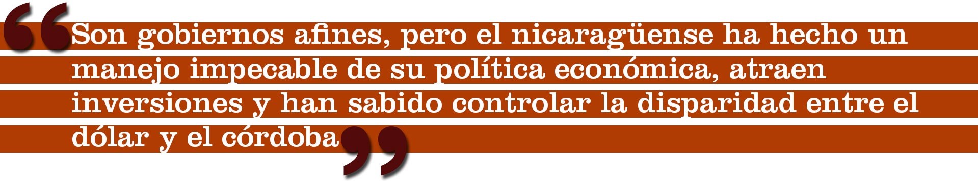 “Son gobiernos afines, pero el nicaragüense ha hecho un manejo impecable de su política económica, atraen inversiones y han sabido controlar la disparidad entre el dólar y el córdoba. Es una política que aplican desde los noventa, lo que también habla de disciplina fiscal y monetaria”, concluye.