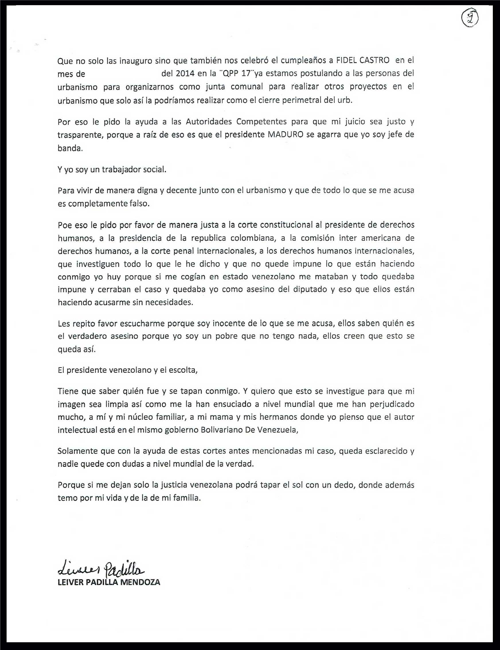 “El asesino de Serra pulula en el Gobierno Bolivariano», jura “El Colombia”. Leiver Padilla Mendoza, está convencido de que la verdadera mente criminal, la que ordenó el asesinato del diputado Robert Serra, se mueve dentro del propio Gobierno. Sin tener las pruebas, suelta esa perla, pero su convicción de chavista —la misma que lo hizo ser fiel al Comandante Supremo y buscarle votos en todas las contiendas electorales en las que participó— lo lleva a defender su verdad. Esa que jamás le avalarán, aunque vuelva a nacer. Con puño y letra, entre los barrotes de la cárcel de Cómbita en Bogotá, el 23 de mayo de 2015, vomitó todo lo que sentía, aquello que lo perturbaba y lo que realmente cree del homicidio del diputado Serra y de su asistente. Sin mayor miedo que el de perder la vida escribió en un cuaderno —que se convirtió en su mejor amigo—su testimonio. Pidió ser escuchado, y a su madre le encomendó que difundiera la carta y que le entregara una copia al mismísimo presidente Juan Manuel Santos.