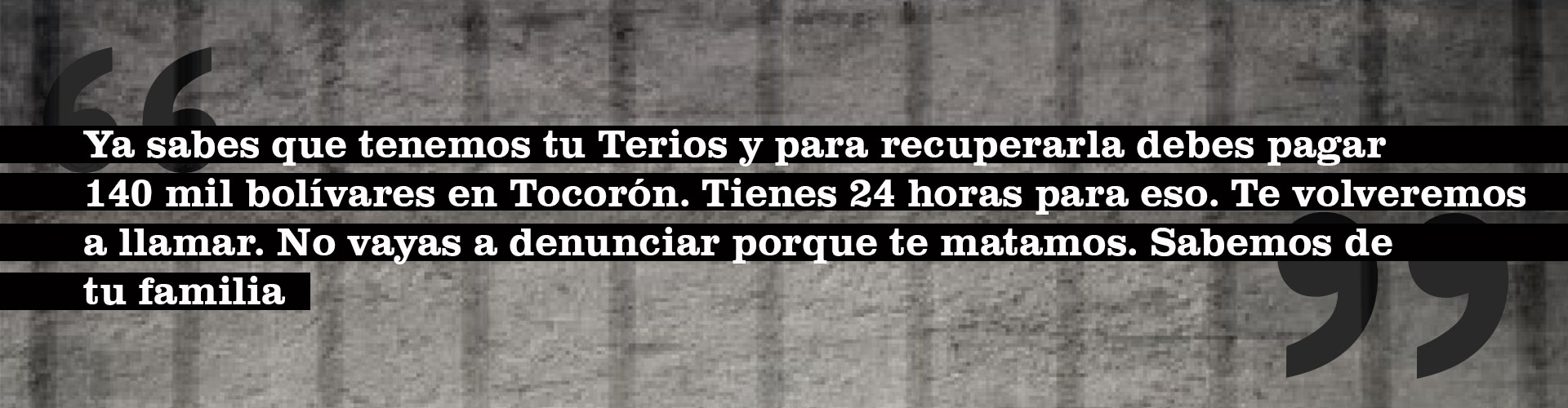 No pasaron treinta minutos y el teléfono repicó. “Número desconocido». El interlocutor le dijo —Ya sabes que tenemos tu Terios y para recuperarla debes pagar 140 mil bolívares en Tocorón. Tienes 24 horas para eso. Te volveremos a llamar. No vayas a denunciar porque te matamos. Sabemos de tu familia.