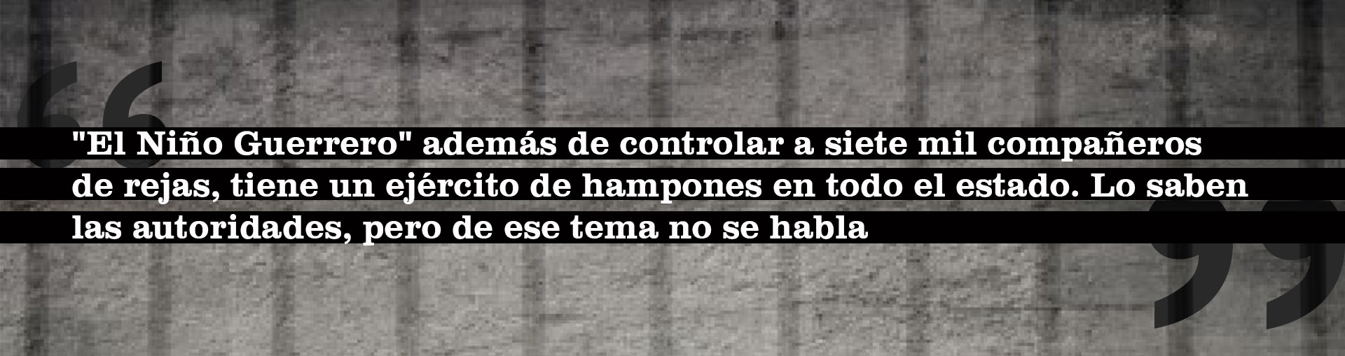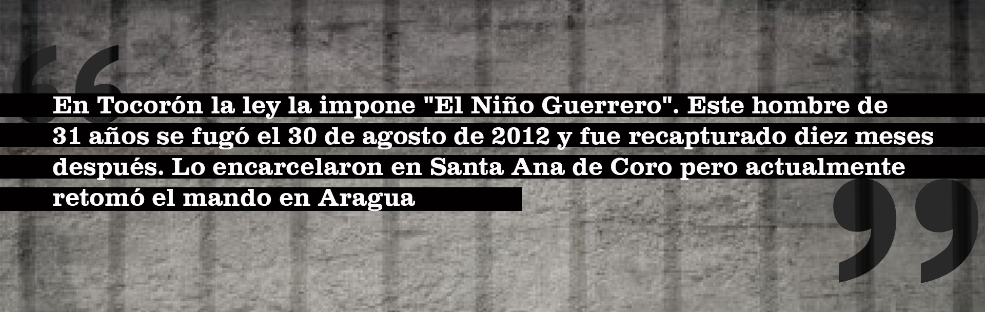 En Tocorón hay siete mil presos aproximadamente. Allí no existe control por parte del Ministerio de Servicios Penitenciarios. La ley la impone «el Niño Guerrero». Este hombre de 31 años, se fugó el 30 de agosto de 2012 y fue recapturado diez meses después. Lo encarcelaron en Santa Ana de Coro, modelo con régimen de convivencia, pero actualmente retomó el mando en Aragua. No hay quien explique por qué lo regresaron. Lo cierto es que, además de controlar a siete mil compañeros de rejas, tiene un ejército de hampones en todo el estado. Lo saben las autoridades, pero de ese tema no se habla.