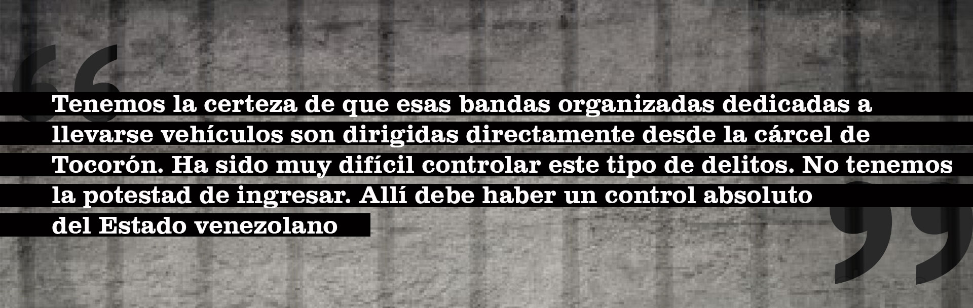 “Tenemos la certeza de que esas bandas organizadas dedicadas a llevarse vehículos son dirigidas directamente desde la cárcel de Tocorón. Ha sido muy difícil controlar este tipo de delitos. No tenemos la potestad de ingresar. Allí debe haber un control absoluto del Estado venezolano”, refirió el funcionario. Luego de tres semanas, Ana aún no ha logrado completar los 70 mil bolívares que le faltan para poder recuperar su Terios. Apeló a las redes sociales, Facebook, para vender algunas pertenencias y reunir el dinero.
