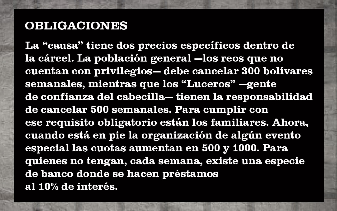 Ambas hicieron cola para ingresar a la prisión. Fueron requisadas por los funcionarios de la Guarida Nacional Bolivariana y ellas sin poder decir ñe. Les preguntaron a quién iban a visitar. Dijeron un nombre —previa instrucción recibida— y no les revisaron la cartera. Entraron hasta un espacio donde fueron recibidas por un sujeto que ya sabía hasta sus números de cédulas. Las pasaron a una especie de oficina improvisada, por separado, donde otros dos contaron billete por billete la bicoca. Cuando las cuentas cuadraron, a Ana le dijeron que volviera una semana después. Gisela, por su parte, corrió con más suertes: le dieron las llaves de su Caliber —que estaba en un estacionamiento de Maracay.