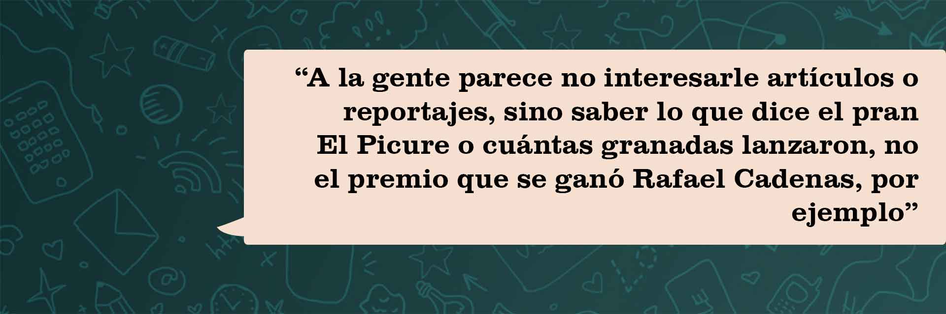 Mensajes en cadena inundan los chats de la aplicación, solicitando desde las medicinas más escasas hasta un golpe de Estado, sin importar el fin último del grupo. El copiar y pegar es una de las formas más sencillas de transmitir chismes y comunicados. Luis Pineda vive con ello todos los días en el bolsillo de su pantalón. Cerca de cien personas —muchos “amigos de toda la vida”— con distintas coordenadas nacionales le dan un panorama general de lo que sucede en el país en tiempo real. Desde su perspectiva, “a la gente parece no interesarle artículos o reportajes, sino saber lo que dice el pran El Picure o cuántas granadas lanzaron, no el premio que se ganó Rafael Cadenas, por ejemplo”, explica el comerciante. Los ocho meses que lleva en el grupo le mostraron la desinformación que puede circular por medio de estas conversaciones multilaterales. Lo rodea y lo desquicia. “A veces veo que se vuelven locos pasando información que no es, vieja o repetida y la gente los desmiente. No sé si es la situación socioeconómica y política que los lleva a desesperarse”, se lamenta.