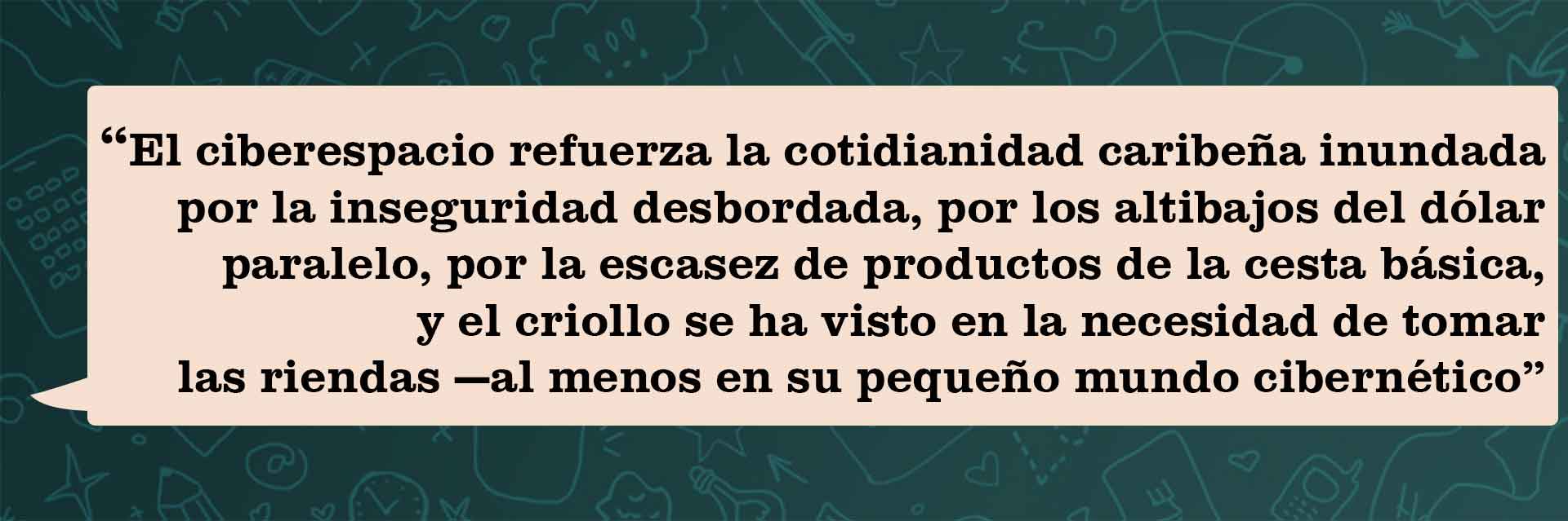 Más allá del morbo y el sadismo, la aplicación móvil permite una visión de 360 grados de las miserias y vivezas criollas a más de la mitad de la población con celulares inteligentes. De acuerdo con el periodista especializado en informática y Telecom, Fran Monroy, WhatsApp es la más usada. “Entre 50 y 60% de usuarios debe tener”. El ciberespacio refuerza la cotidianidad caribeña inundada por la inseguridad desbordada, por los altibajos del dólar paralelo, por la escasez de productos de la cesta básica, y el criollo se ha visto en la necesidad de tomar las riendas —al menos en su pequeño mundo cibernético.