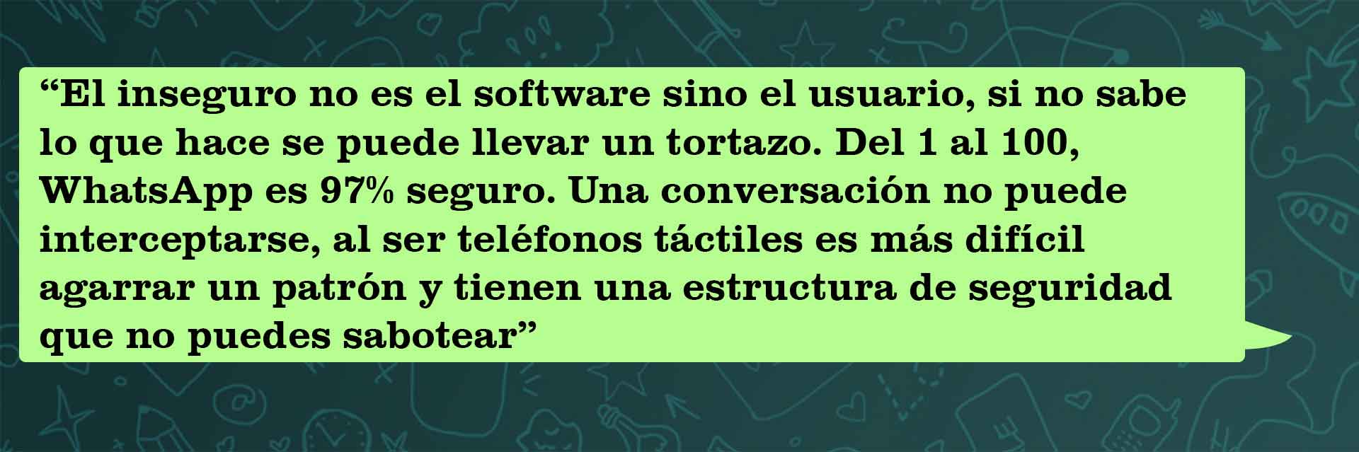 Así como se persigue la seguridad de la comunidad con datos, consejos y sucesos que prever, los mensajes que por allí se transmiten pueden llegar a las manos equivocadas, traspasando los límites de la conversación grupal. Salvaguardar las contraseñas, números de cuenta y direcciones es cada vez más pertinente en un mundo de hackers y piratas. Sin embargo, Monroy derriba las creencias populares de la filtración de información y afirma que la culpa no es ni de WhatsApp ni de la vaca. “El inseguro no es el software sino el usuario, si no sabe lo que hace se puede llevar un tortazo. Del 1 al 100, WhatsApp es 97% seguro. Una conversación no puede interceptarse, al ser teléfonos táctiles es más difícil agarrar un patrón y tienen una estructura de seguridad que no puedes sabotear”, destaca. Mientras el celular con la mensajería instantánea no sea robado y su dueño se convierta en parte de las estadísticas, nadie salvo los miembros del chat poseerá la data.