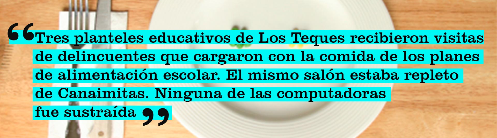 Según reporta el diario La Región, el fin de semana del 30 de abril y primero de mayo, tres planteles educativos de Los Teques, la capital mirandina, recibieron visitas de delincuentes que cargaron con la comida de los planes de alimentación escolar. En las unidades educativas “Colinas del Ángel”, en el sector del mismo nombre, Clavelito en Guaremal, y Taller Rafael Urdaneta en El Vigía, “se llevaron víveres, carne y pollo que eran para la comida de la semana”, dijo Mirta Hernández, directora del primero de los lugares, donde desaparecieron pacas de harina, arroz, caraotas, leche y azúcar que estaba el mismo salón repleto de Canaimitas. Ninguna de las computadoras fue sustraída.