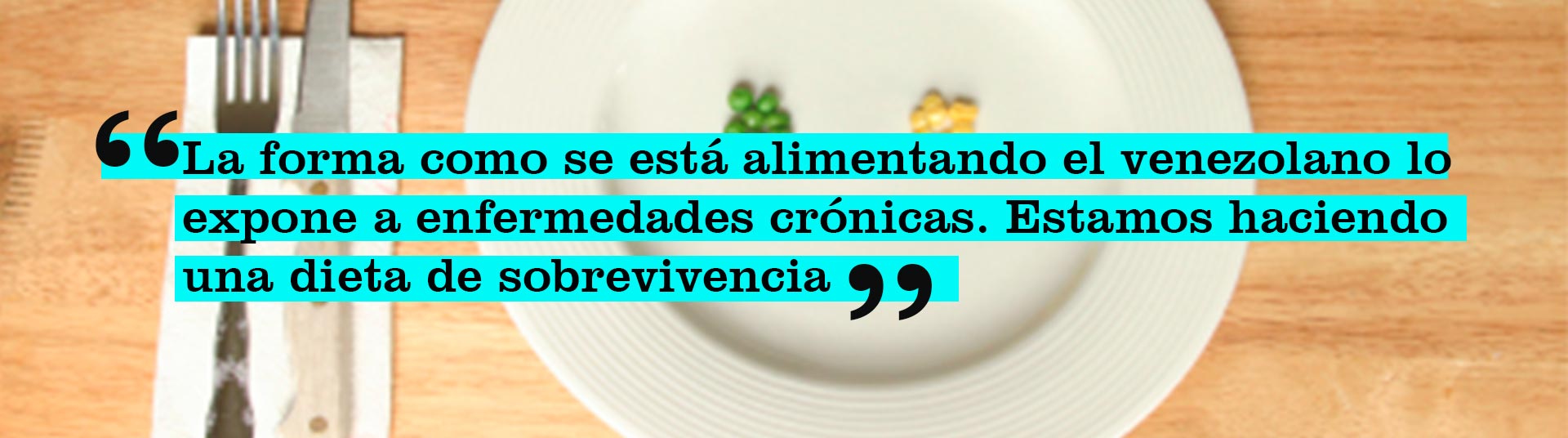 En su último informe, la Organización de las Naciones Unidas para la Alimentación y la Agricultura (FAO) reseñó que en 2014 los adultos con obesidad o sobrepeso en Venezuela representaban 67% de la población, a su vez divididos en 67,8% hombres y 66% mujeres. Otro estudio, la encuesta sobre Condiciones de Vida de los Venezolanos (Encovi) en su capítulo sobre alimentación, refleja cómo los hábitos alimenticios empeoraron entre 2014 y 2015. Los datos fueron registrados recientemente tras una consulta nacional, de 1.488 encuestas realizadas en 23 ciudades del país (entre principales, medianas, pequeñas y caseríos), y revelan que 12,1% de la población come dos veces al día o menos, cuando en 2014 ese porcentaje se ubicó en 11,3%.