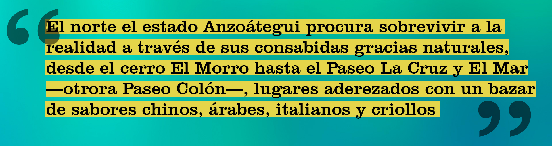 ¿Qué ofrecen, entonces, al turista o al visitante circunstancial? Además de una criminalidad creciente, playas contaminadas y la inflación que allana a todo el país, el norte el estado Anzoátegui procura sobrevivir a la realidad a través de sus consabidas gracias naturales, desde el cerro El Morro hasta el Paseo La Cruz y El Mar —otrora Paseo Colón—, lugares aderezados con un bazar de sabores chinos, árabes, italianos y criollos, pero también gracias a la gente que no abandona proyectos y que a diario consuma la pequeña victoria de una jornada laboral contra todos los pronósticos.
