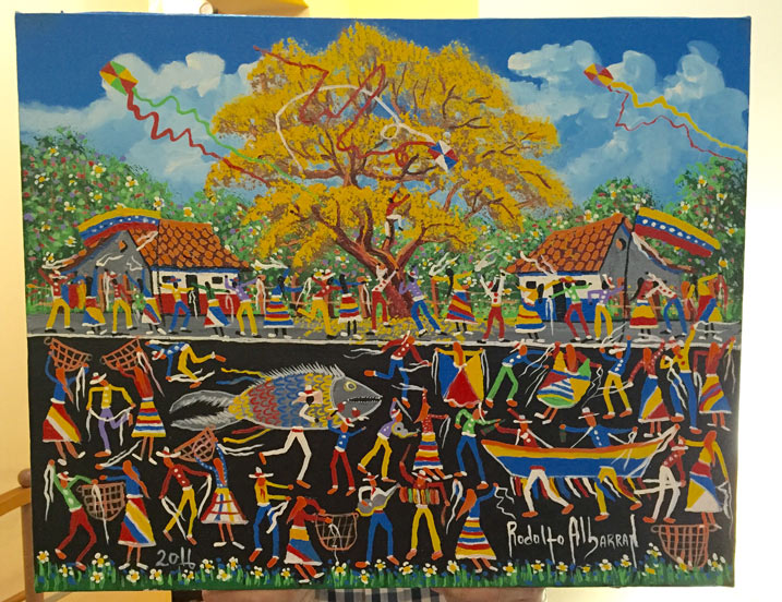 —Pasando por el Paseo Colón, —venía de trabajar pegando porcelana en una construcción— vi a un señor vendiendo un cuadro en 600 bolívares. Luego regresé y me di cuenta de que estaba vendiendo otro cuadro. Me dije a mí mismo que yo también era capaz de pintar. Pinté cuatro canvas pequeños y fui al Paseo Colón a venderlos. Allí un pintor me dijo: aquí no te puedes poner, tienes que hacerlo más allá porque me tumbas el negocio. Cuando lo hice otro pintor me sacó del lugar. Pero ¿qué pasó? Que gracias a Dios esa noche vendí los cuatro cuadritos en cincuenta bolívares cada uno. Luego me tomé una cerveza y dije: de aquí en adelante no le trabajo a nadie sino que trabajo para mí, para mis sentimientos. —Con esa primera venta se convenció de que podía pintar.