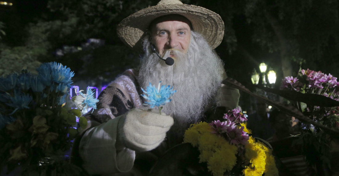 En un carro adornado con flores, seguido por un grupo de niños y niñas vistiendo ruanas y sombreros de paja, Pacheco, como todos los años, recorre el centro de Caracas arrojando flores a quienes consigue a su paso.