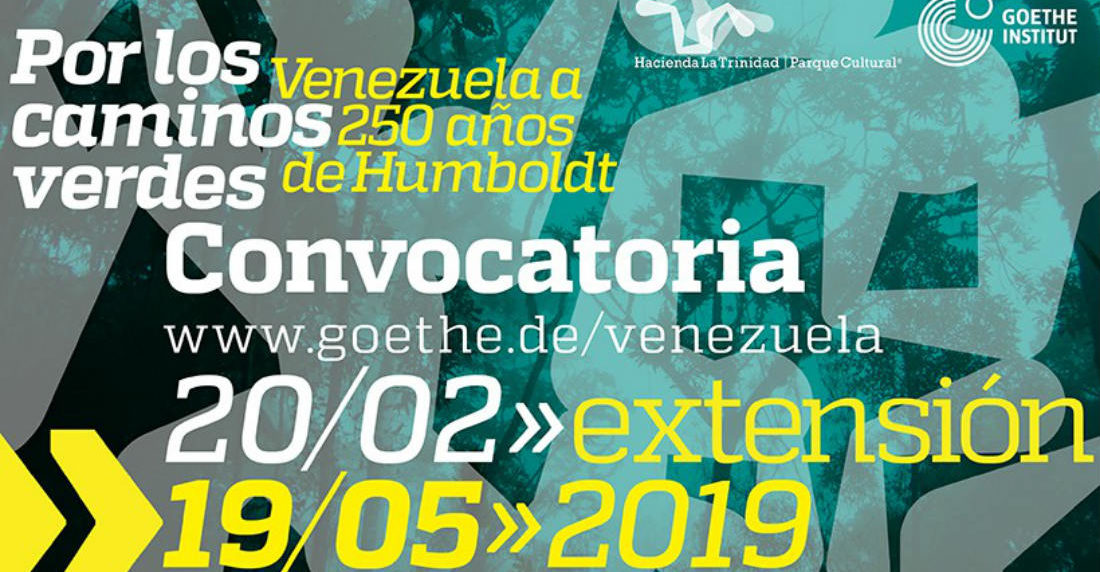 ‘Por los caminos verdes. Venezuela 250 años después de Humboldt‘, es organizada por el Goethe-Institut Caracas en coproducción con la Hacienda La Trinidad Parque Cultural y está dirigida a artistas y colectivos venezolanos y extranjeros entre los 25 y 40 años de edad que quieran contribuir al panorama del arte contemporáneo venezolano en cualquiera de estas categorías: pintura, escultura, fotografía, gráfica, instalación y videoarte.