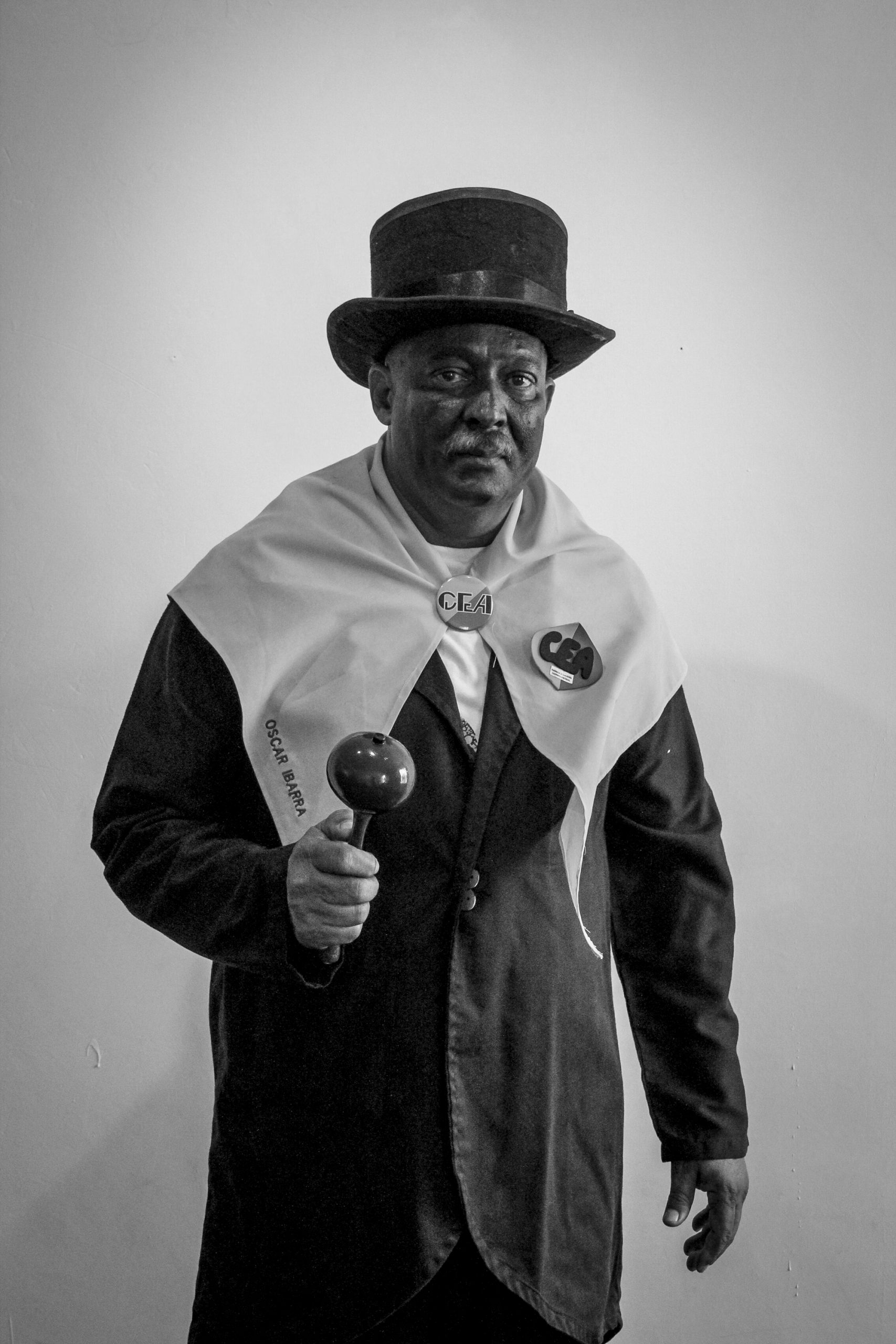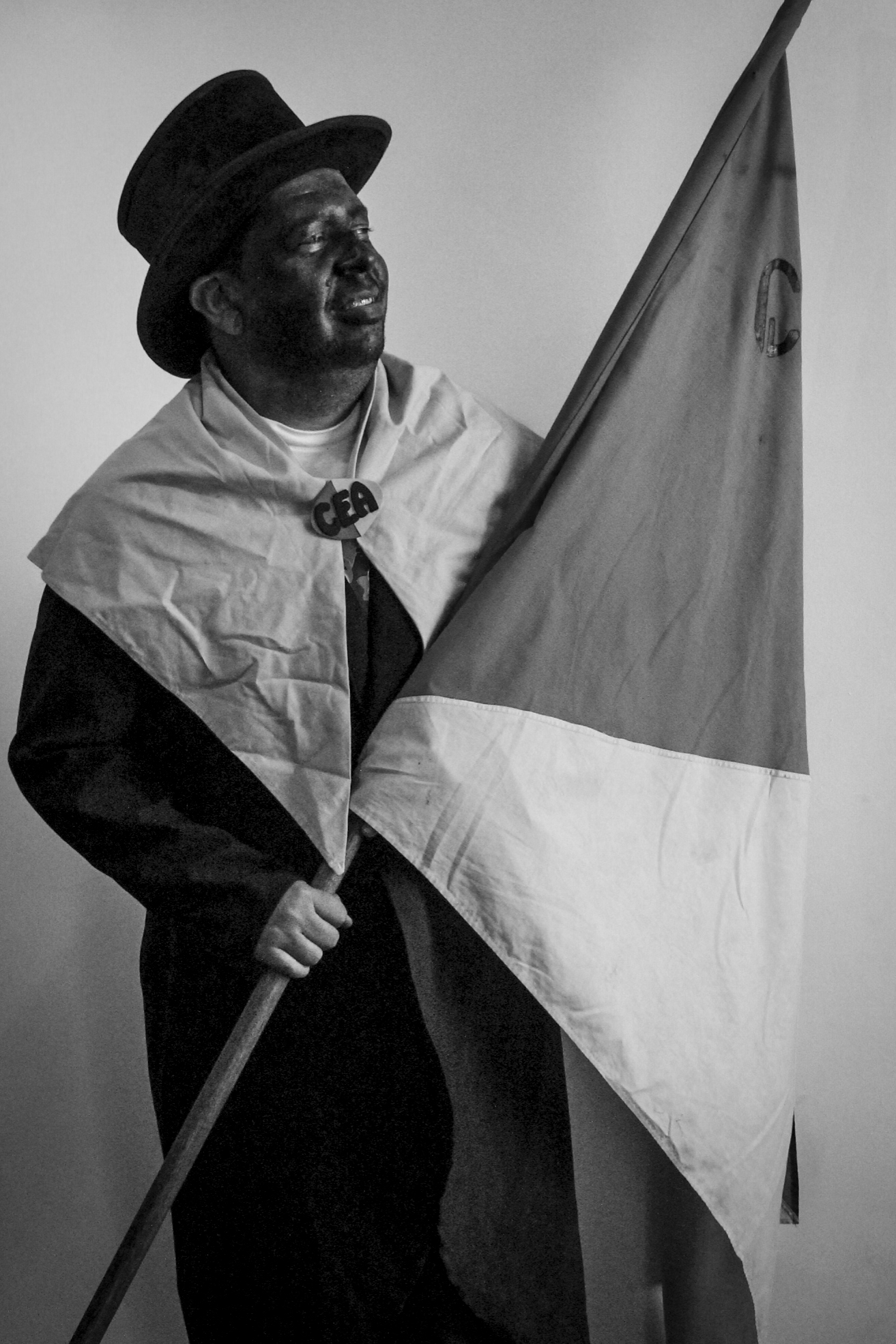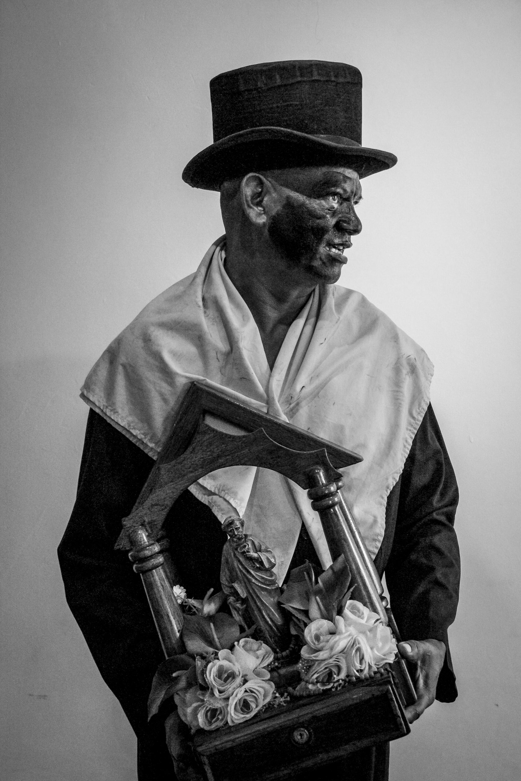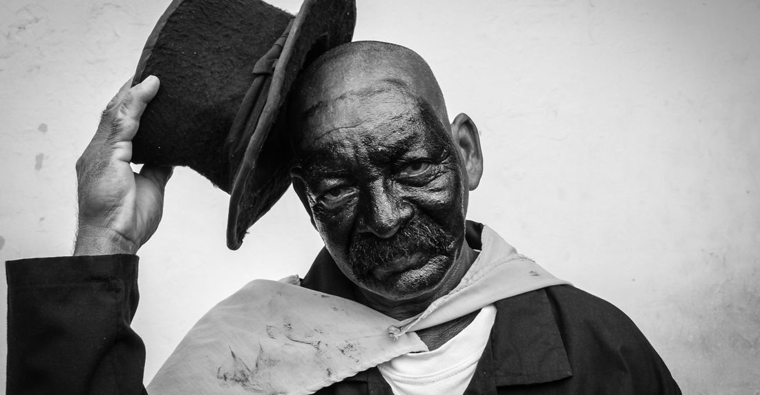 Hombres vestidos con la levita vieja del amo, sombrero Pumpá y alpargatas, llevando la cara cubierta de betún negro.