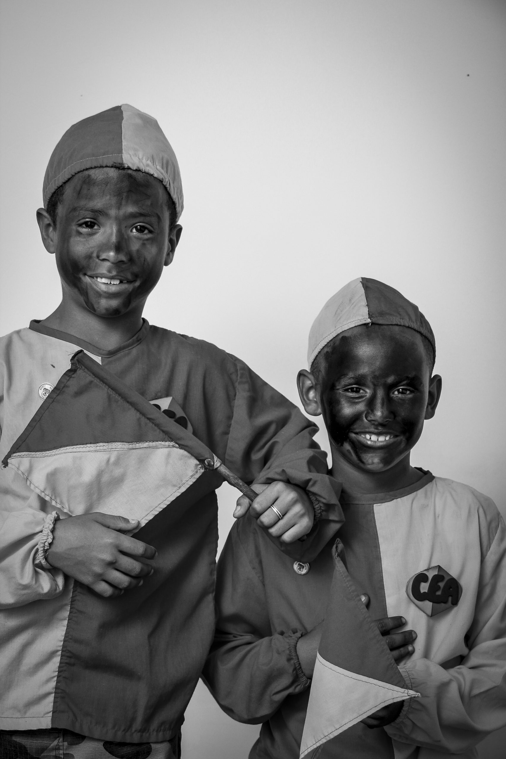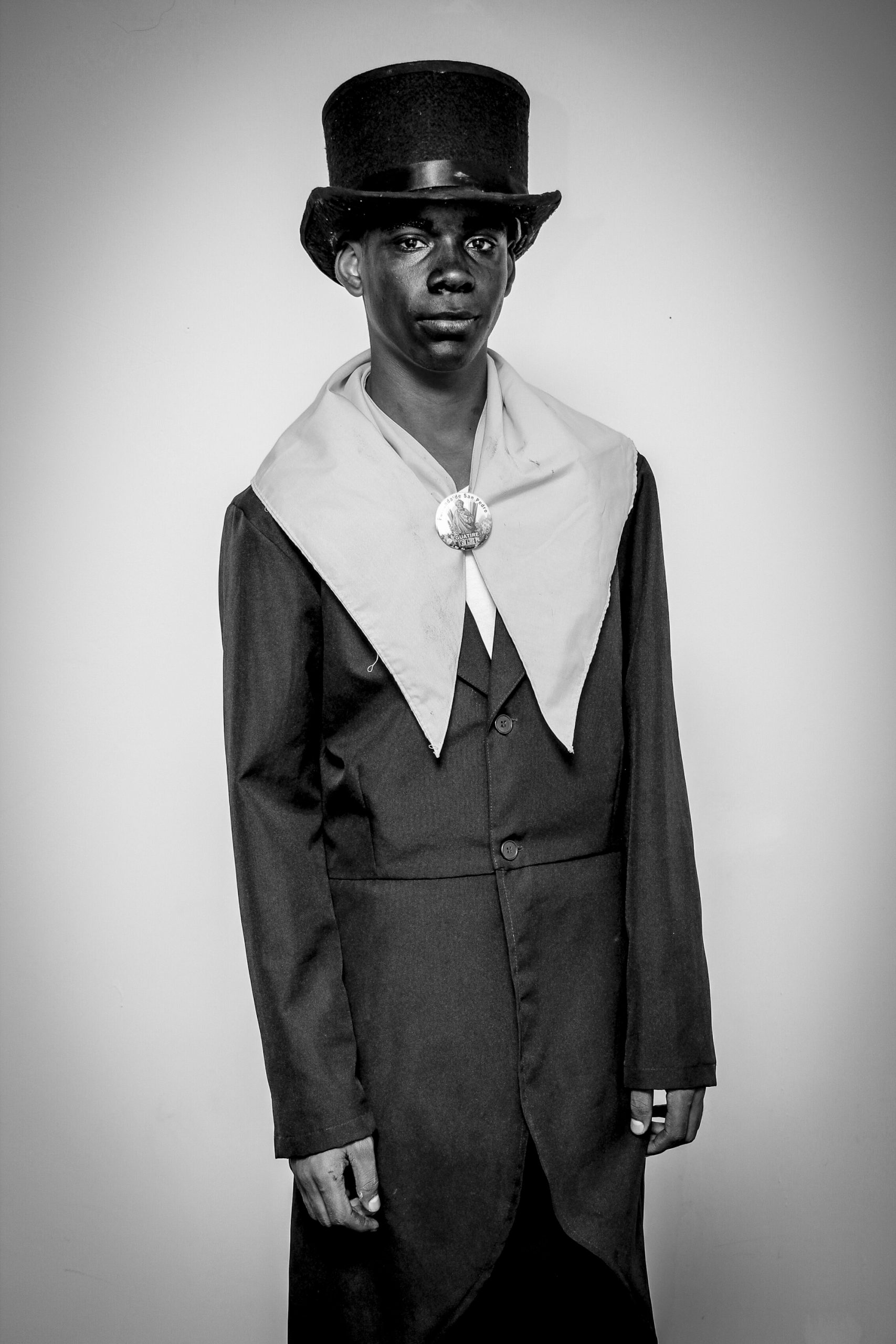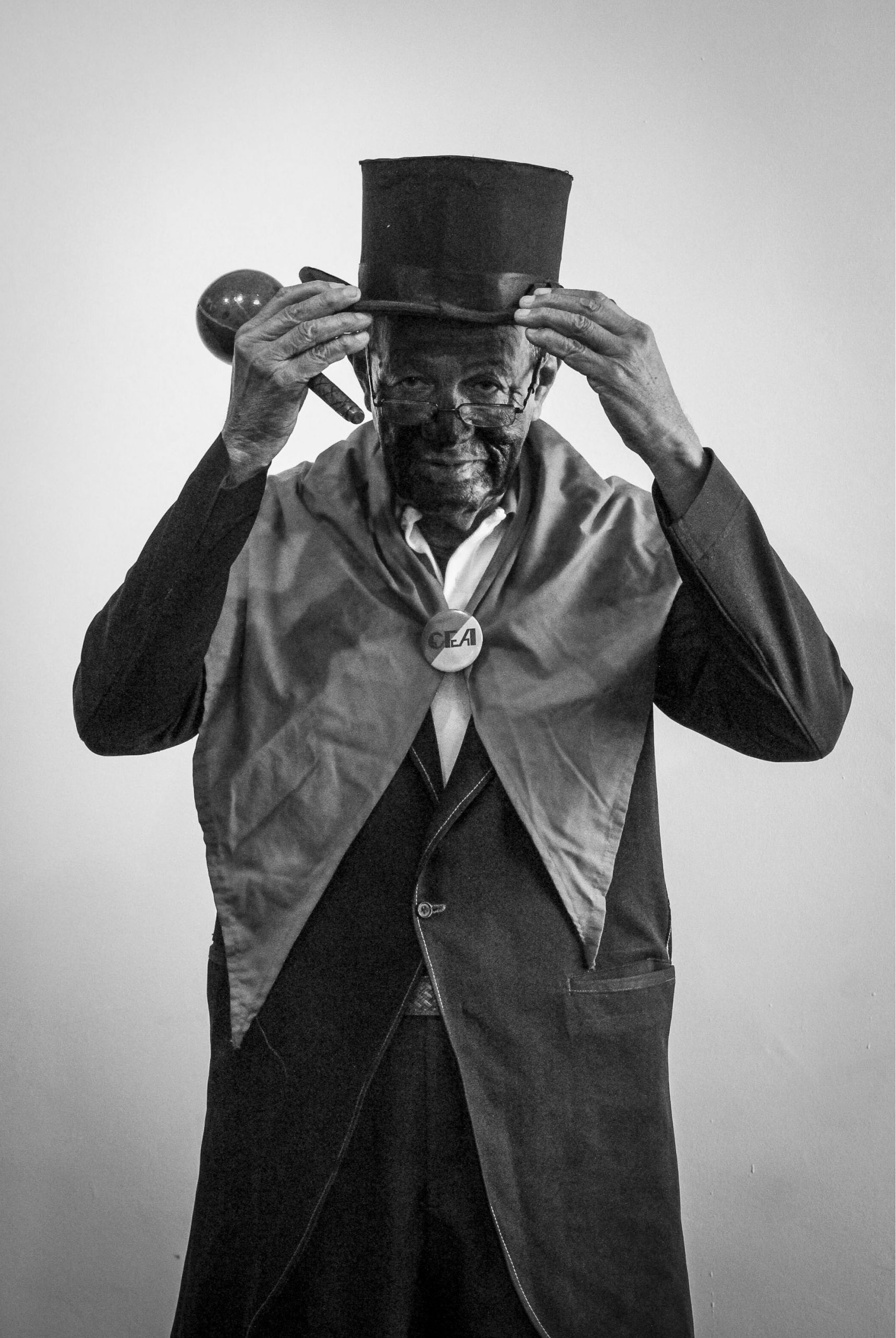 Hombres vestidos con la levita vieja del amo, sombrero Pumpá y alpargatas, llevando la cara cubierta de betún negro.