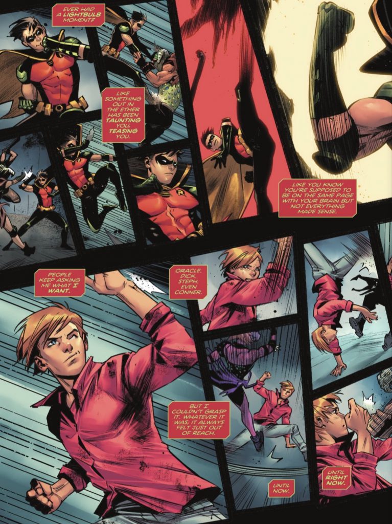 En esta serie, el compañero de aventuras de Batman es encarnado por Tim Drake y en la sexta entrega del cómic, que salió hoy, en el último cuadro de la publicación le dice que sí a una propuesta de salida que le hace su amigo, llamado Bernard Dowd.