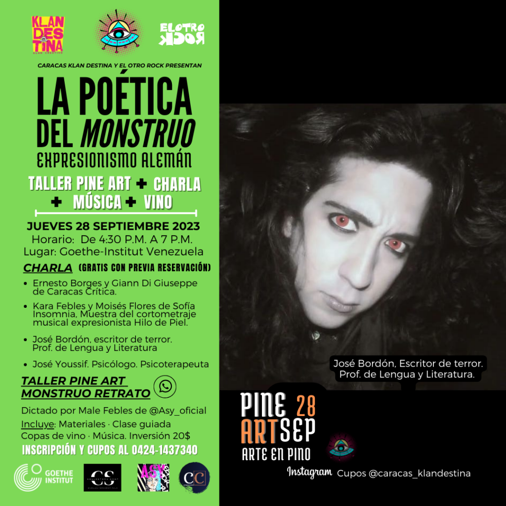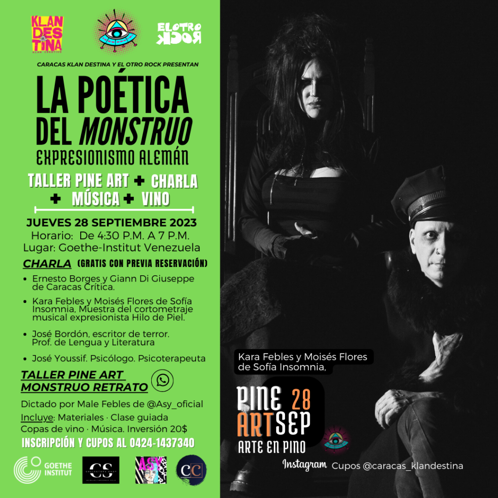 LA POÉTICA DEL MONSTRUO comenzará con una interesante charla a cargo, por una parte, de los investigadores Ernesto Borges y Giann Di Giuseppe, creadores de la plataforma intelectual Caracas Crítica, indagando sobre el expresionismo alemán y la temática del monstruo como fenómeno social y cultural, por otra parte, de Kara Febles (Comunicadora Social/Cantante/Actriz) y Moisés Flores (Músicos Publicista), ambos compositores y directores artísticos de Sofía Insomnia, que abordarán este tema desde la perspectiva de su cortometraje musical “Hilo de Piel”, una suerte de diálogo surrealista con el film “Fausto” de Murnau de 1926 y la peste que allí acontece.