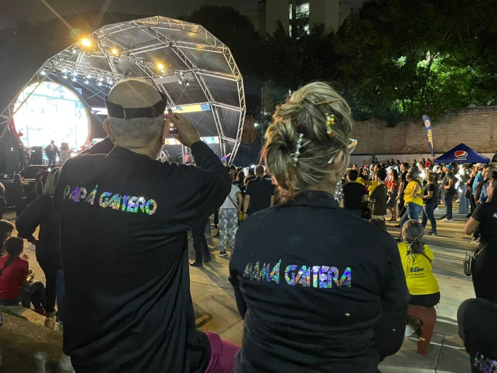 Mamá y papá gaiteros en el Gaitazo del Colegio Santa Rosa de Lima. Llevar una franela con esa identificación en la zona de la espalda es común y sirve para crear vínculos entre padres. Foto: María José Dugarte.