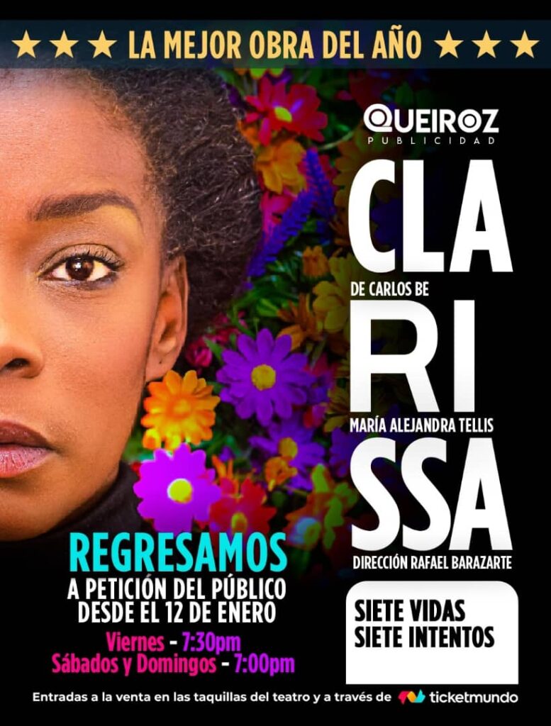 El montaje que se estrenó el mes de octubre del 2023 recibiendo distintos elogios manifestados por redes del público y del gremio teatral en general. Clarissa formó parte de la bienvenida que realizó Trasnocho Cultural a propósito de la visita del dramaturgo español Carlos Be a Caracas en el mes aniversario del Centro Cultural.