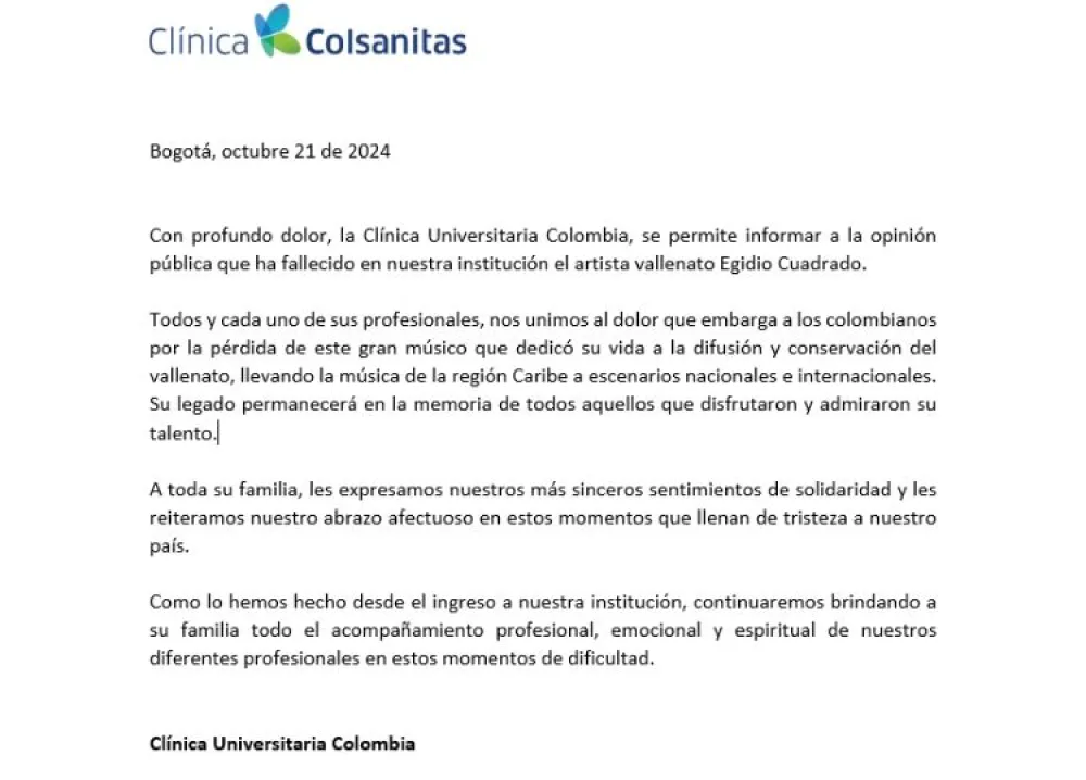 Parte del texto reza: «Con profundo dolor, la Clínica Universitaria Colombia, se permite informar a la opinión pública que ha fallecido en nuestra institución el artista vallenato Egidio Cuadrado. Todos y cada uno de sus profesionales, nos unimos al dolor que embarga a los colombianos por la pérdida de este gran músico que dedicó su vida a la difusión y conservación del vallenato, llevando la música de la región Caribe a escenarios nacionales e internacionales», se lee en el comunicado emitido por el centro médico, agregando que el legado del maestro «permanecerá en la memoria de todos aquellos que disfrutaron y admiraron su talento».