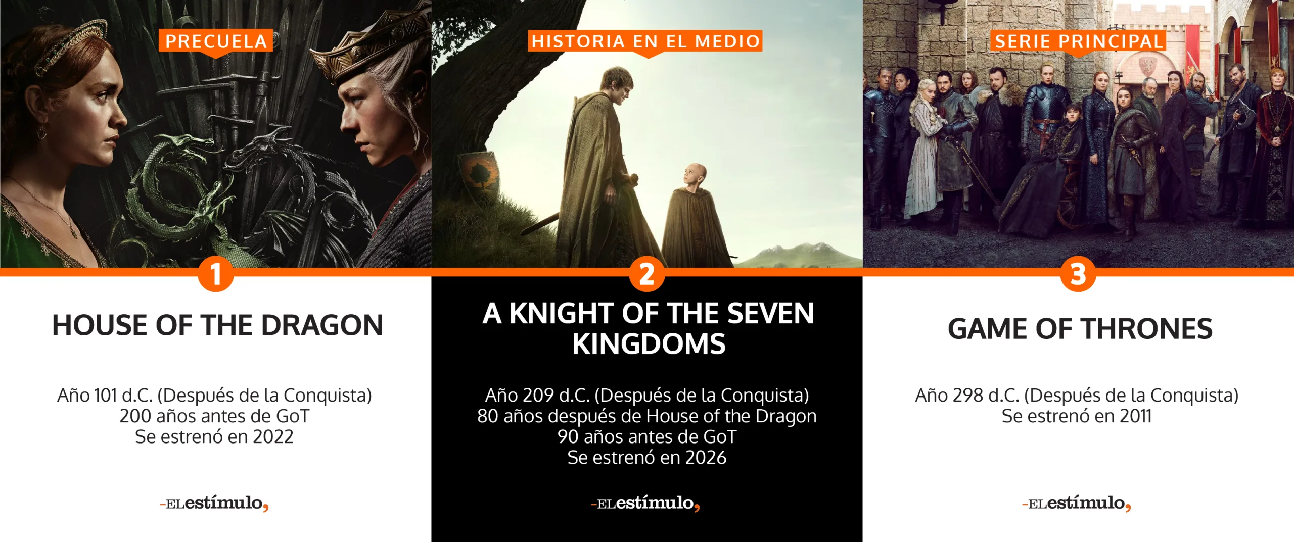 «A Knight of the Seven Kingdoms» (2026): Esta es la historia entre ambas series, tiene un tono menos bélico siendo una historia de relleno. Hasta el 7 de febrero de 2026 se han estrenado 3 episodios de 6, y cada domingo a las 10:00 de la noche, estrena episodio.