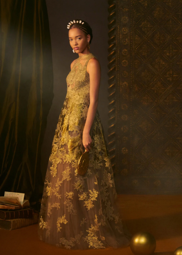 Fue una colección casi monocromática, llena de brillo y texturas de jacquard de seda, donde el oro viejo es protagonista.