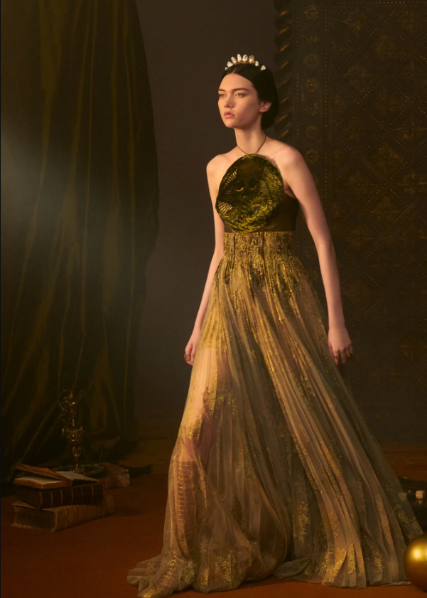 En esta oportunidad, la diseñadora María Grazia Chiurri se inspiró en las artes adivinatorias del tarot, específicamente en un juego de cartas Visconti-Sforza con el que nos transportaron a un castillo medieval, gracias a la magia del cineasta Matteo Garrone, en el que diversos personajes dan vida a la colección como la papisa, el loco, el ahorcado o el diablo.