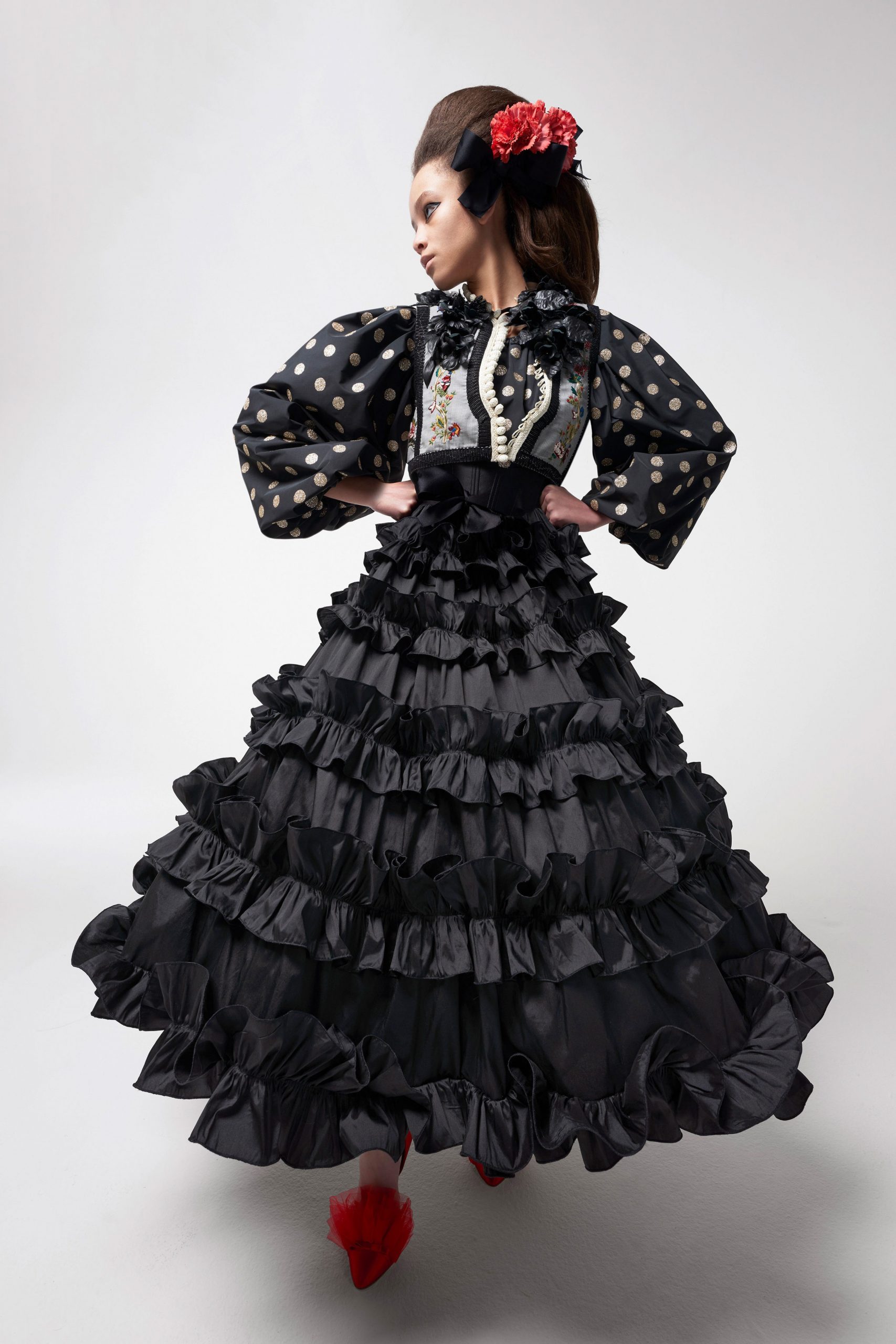 Para complementar la colección, la estilista Odile Gilbert recreó peinados de enorme volumen como los que utilizó Benedetto Barzini o Marisa Berenson en los años 60’s. Y se inspiró también en la mujer sevillana con sus volantes y los tonos rojos, negros y blancos. Fue una de mis colecciones favoritas de la temporada: femenina y fuerte a su vez.
