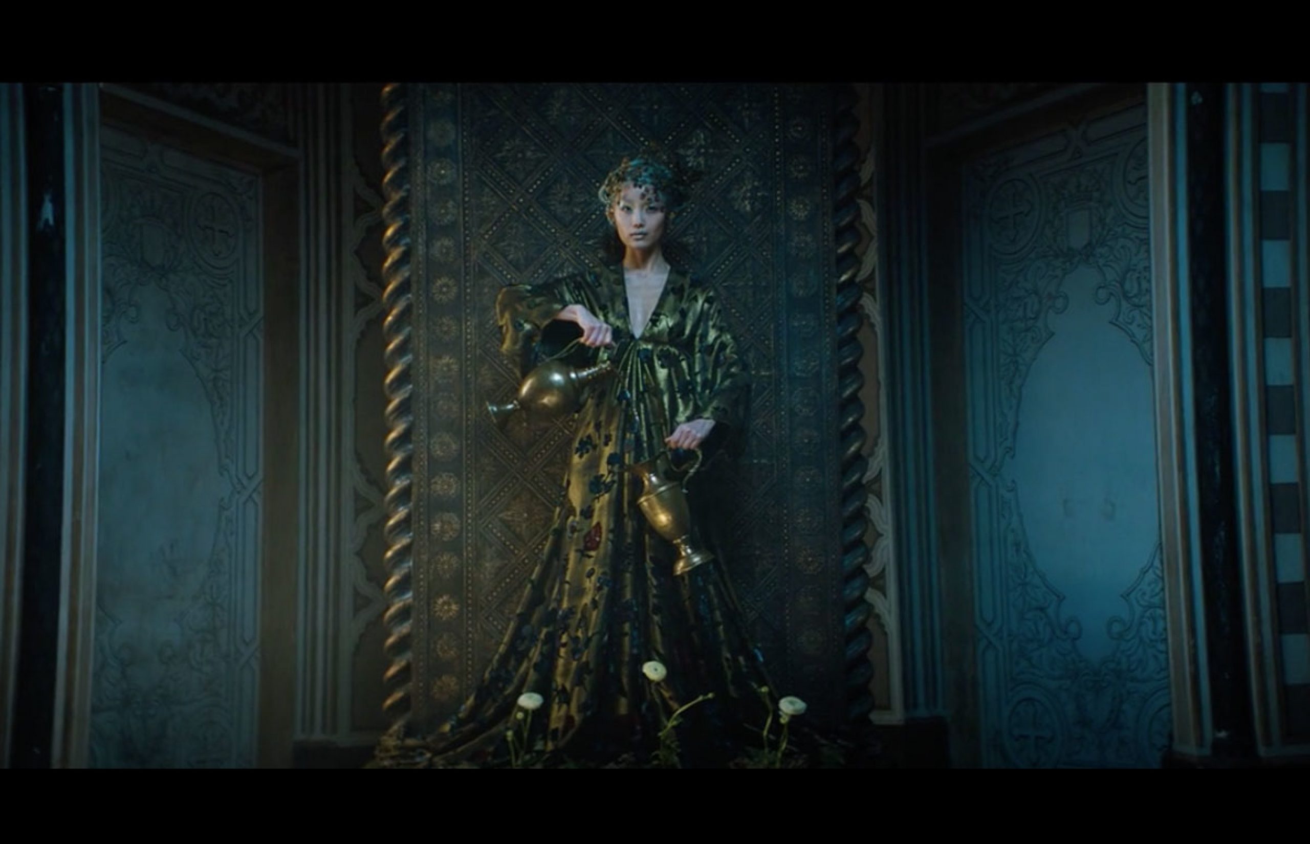 Siluetas inspiradas en las colecciones bizantinas de Romeo Gigli, gran diseñador de los 80’s y 90’s, con siluetas voluminosas, otras drapeadas en telas brillantes, accesorios XXL como los súper zarcillos (muy Gigli) creados por Delfina Delettrez-Fendi, y figuras masculinas andróginas que abren de nuevo el paso a la clientela masculina ávida por consumir alta costura.