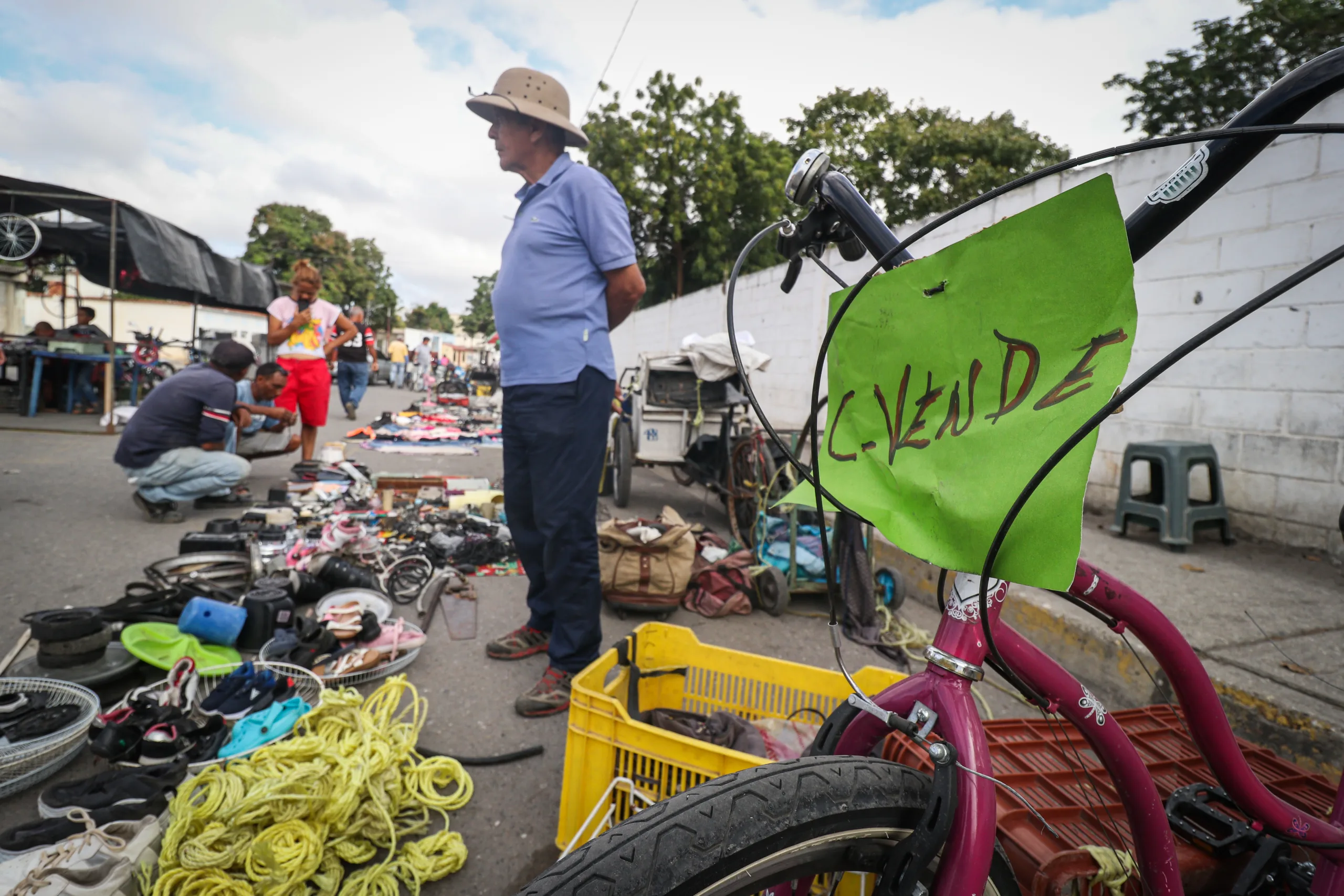 Un hombre busca cosas viejas en su bicicleta, recorre todo Barquisimeto para conseguir el mejor precio. También vende comidaLos controles de viejas Tv se consiguen en los manteles esperando por los compradores que siempre aparecen.