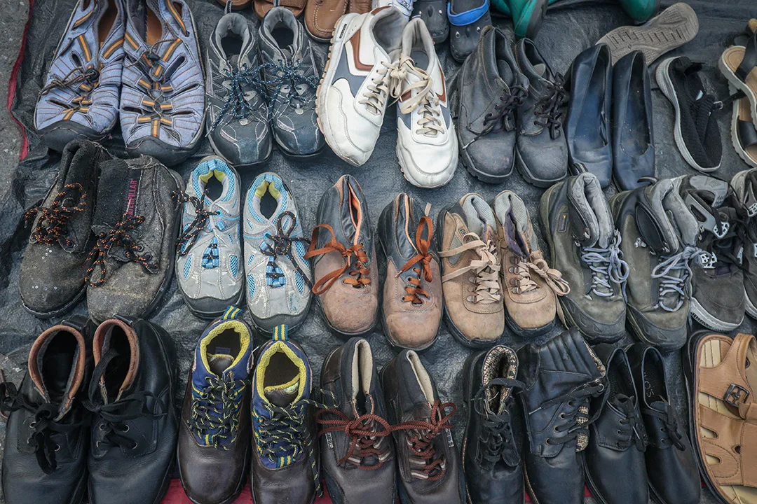 Cerca del mercado de cachivaches también se venden hortalizas y alimentos, la gente no se detiene y trabaja con ánimoEl mantel tiene de todoZapatos viejos y hasta cosidos nuevamente son parte de la mercancía usada