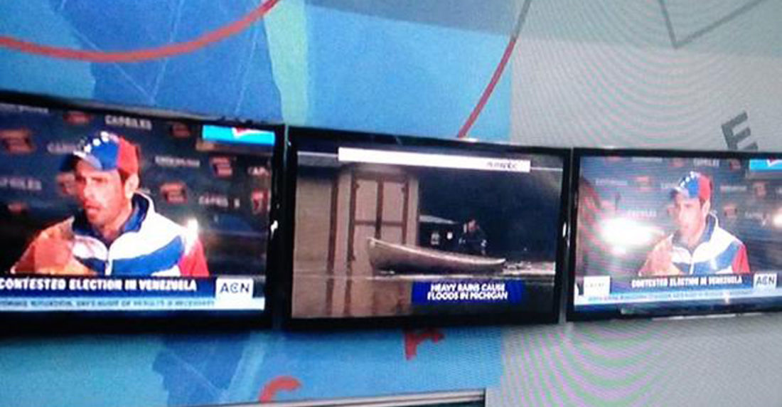 Pero, por un momento, se puede apreciar la gorra tricolor y la característica chaqueta blanca de Capriles, en un discurso, con el insert «Elecciones disputadas en Venezuela».