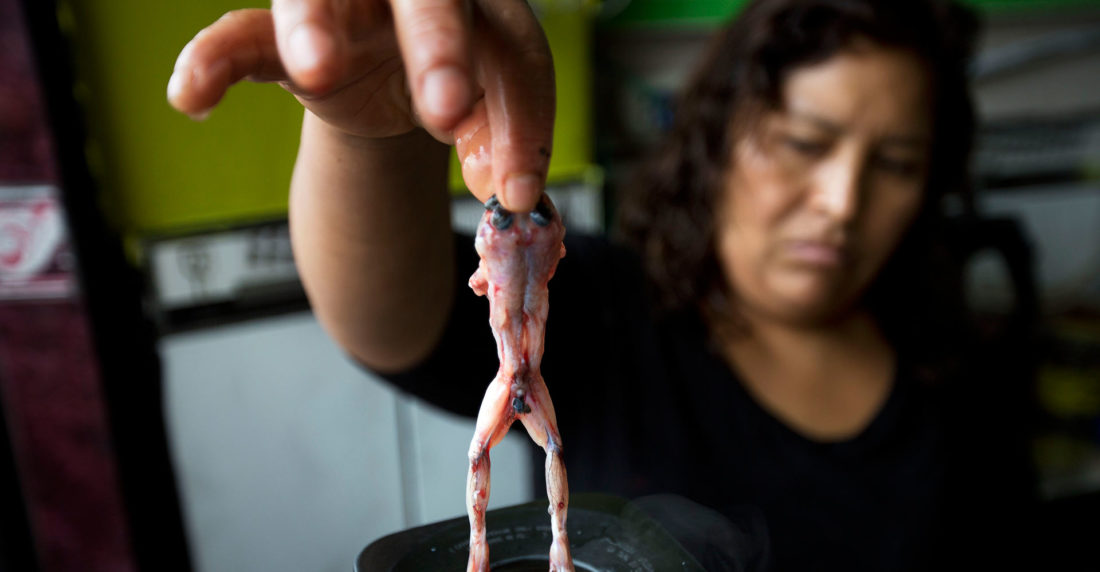 «Sirve para la anemia, los bronquios… el cerebro, cansancio y estrés», dice con convicción María Cruz, vendedora de jugo de rana en una zona obrera de Lima desde hace más de dos décadas.