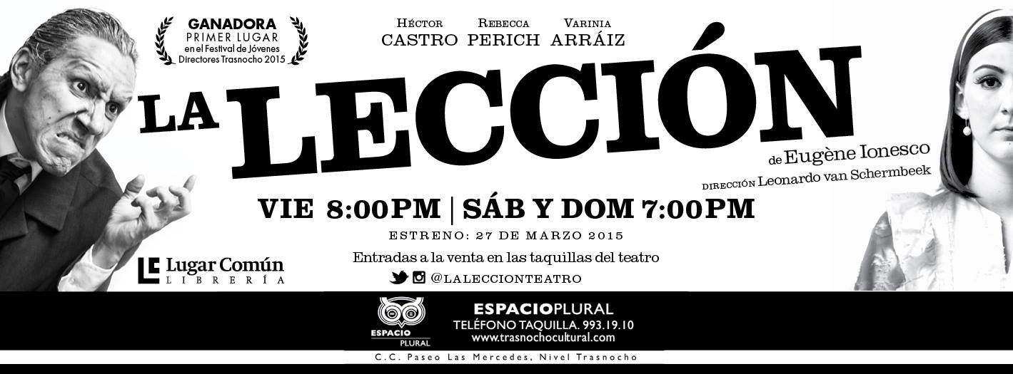 La Lección obtuvo el primer lugar en el Festival de Nuevos Directores del Espacio Plural del Trasnocho y por ello estará en temporada hasta el 10 de mayo de este año.