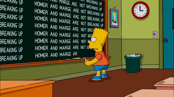 Todo ha resultado muy confuso, pero hoy los productores de Los Simpsons publicaron por Twitter una imagen de Bart escribiendo en la pizarra unas planas que repiten la frase «Homero y Marge no se separarán». En el mismo tweet la cuenta envía el CM de la cuenta pide que se difunda el mensaje a través de un retweet y que «paren los rumores».
