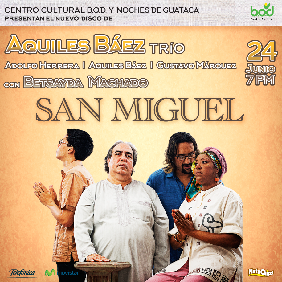La cita para la presentación del disco San Miguel de Aquiles Báez Tríojunto a Betsayda Machado será el próximo miércoles 24 de junio a las 7pm en la sala de conciertos del Centro Cultural BOD. Las entradas se encuentran ya a la venta a través de www.ticketmundo.com y en las taquillas del Centro Cultural.