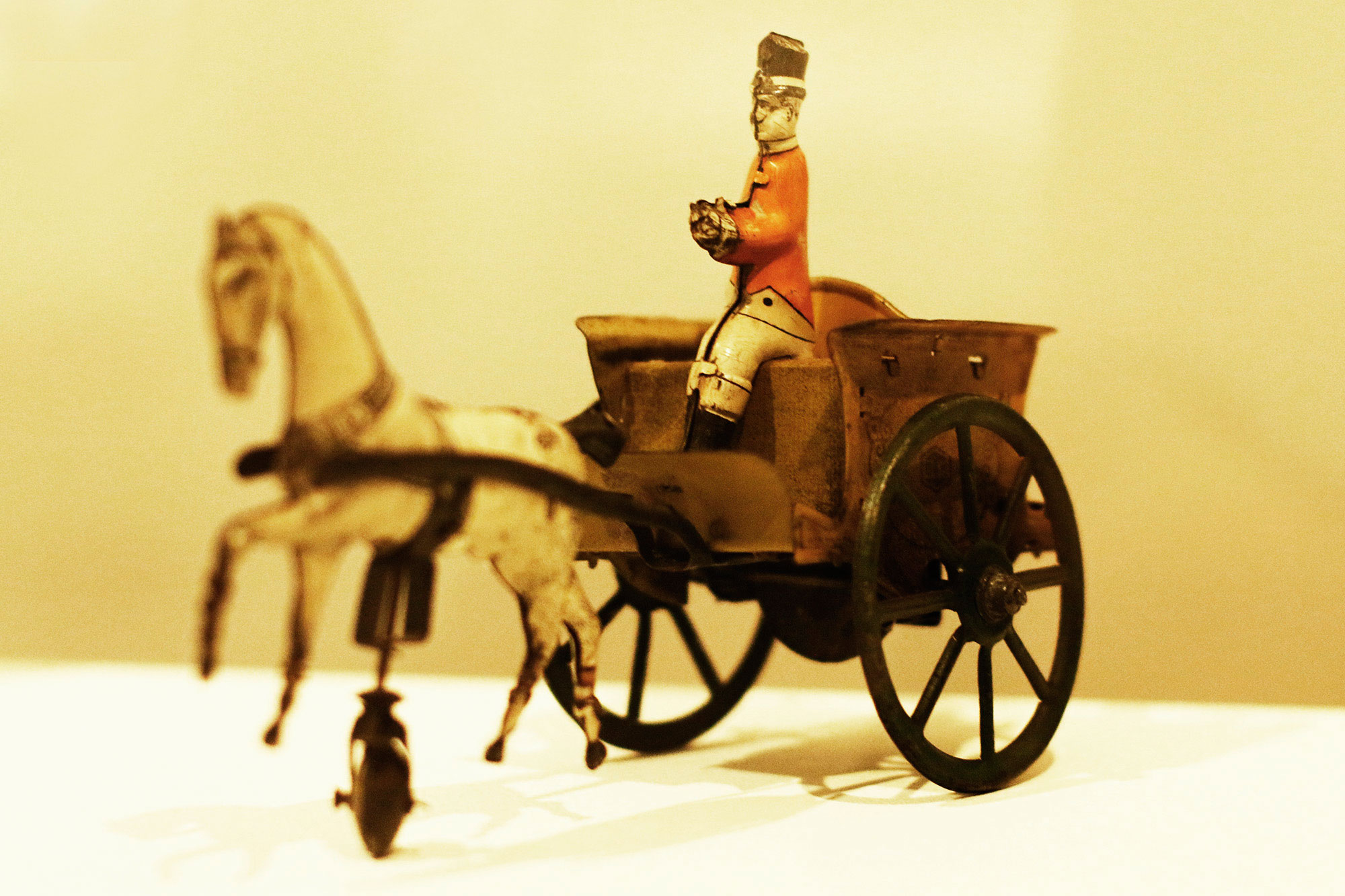 Es un cocherito de la casa alemana Lehman, que manejaba a lo loco y llevaba dos hermanas desagradadas por los movimientos repentinos del coche, una cuyo nombre empezaba por Li, y otra, que llevaba un paraguas, empezaba por La. Lo vio por primera vez en el libro “Antique & Collectible Toys”, que le regaló una suegra estadounidense que tuvo. Enseguida tuvo conexión con la pieza.