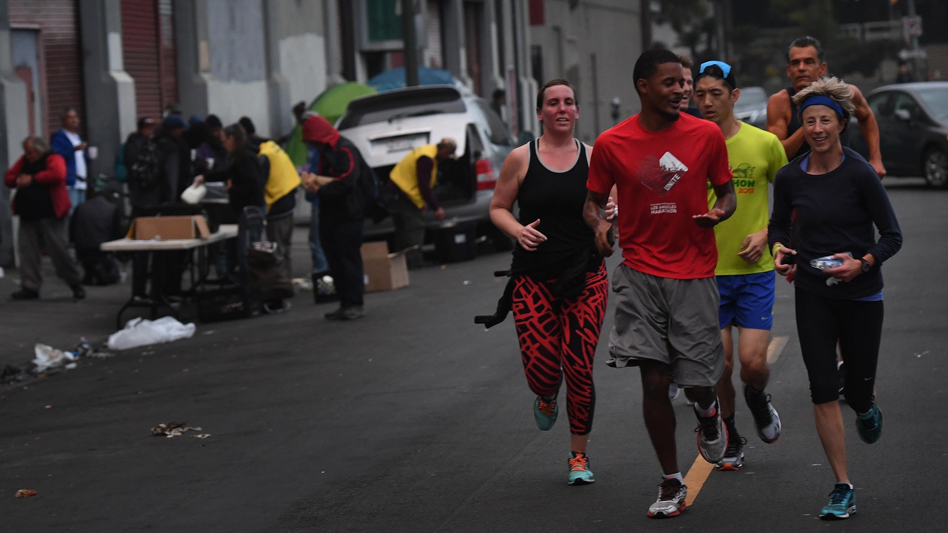 En los 10 km del recorrido por Skid Row, un área de unas 50 cuadras con la mayor concentración de indigentes de Estados Unidos (unos 6.000), los corredores van esquivando la dura realidad que por mucho tiempo los acechó: las tiendas de campaña, los cartones y las lonas de este barrio improvisado en pleno centro de Los Ángeles, que según cifras oficiales tiene unas 47.000 personas viviendo en las calles.