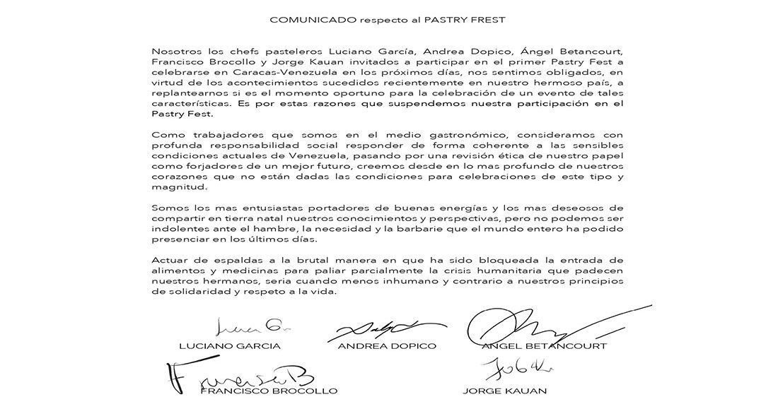 Los chefs Andrea Dopico, Luciano García, Francisco Broccolo, Jorge Kauan y Ángel Betancourt, protagonistas internacionales del Pastry Chef, decidieron suspender su participación en el Pastry Chef como rechazo, por parte del gobierno, a alimentos y medicinas que serían utilizados como ayuda humanitaria.