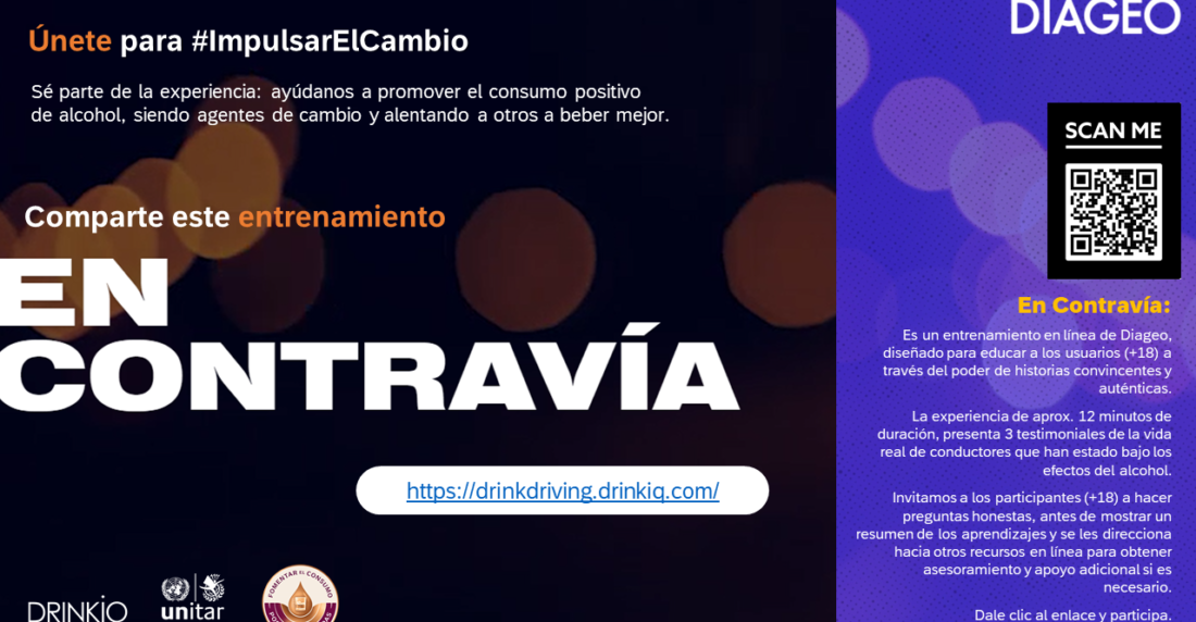Diageo presenta la plataforma en línea “En Contravía” (The Wrong Side of The Road, en inglés) desarrollada en colaboración con el Instituto de las Naciones Unidas para la Formación y la Investigación (UNITAR). Este programa permite a las personas mayores de edad comprender mejor los efectos y el impacto de ingerir alcohol al conducir, a través de una conversación virtual con un conductor real.