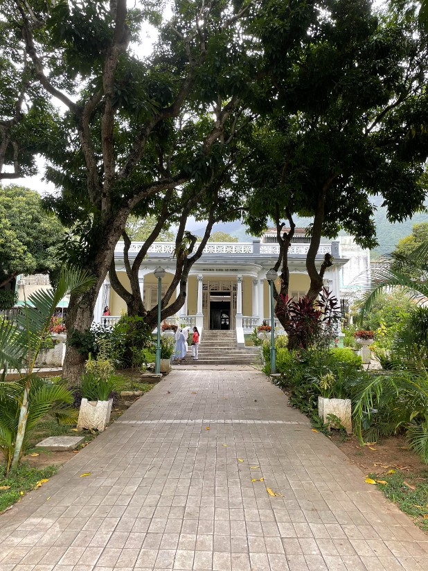 En la entrada desde la avenida principal, mucho más importante que la anterior, vemos una solución más afrancesada con caminerías y fuentes trazadas de manera geométrica, a ambos lados de la ancha acera de entrada que conduce a las escalinatas del porche.