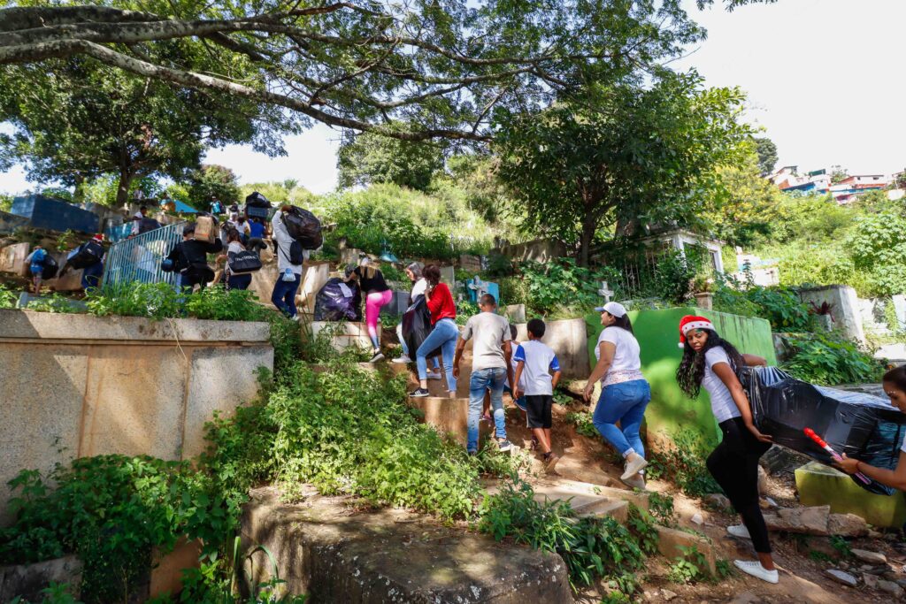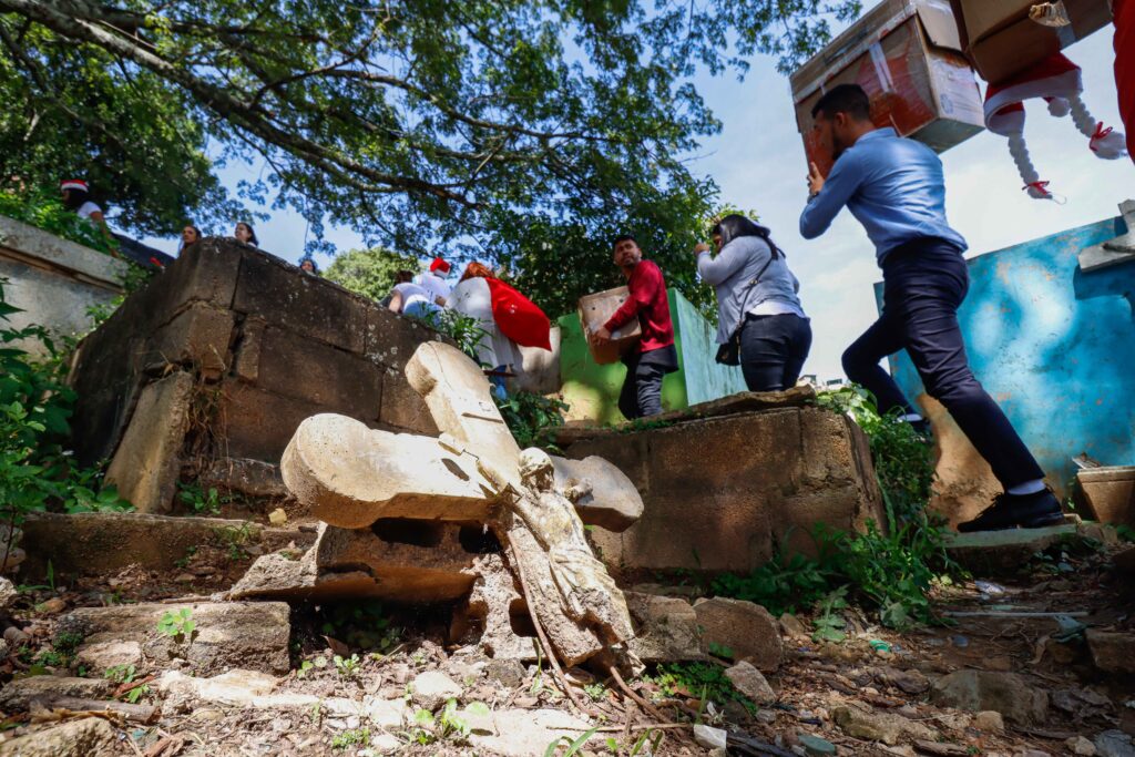 Todos los vehículos entraron al Cementerio General del Sur y se detuvieron en un punto, donde era necesario para poder continuar a pie el camino. La subida, tal como fue advertido, se volvió cuesta arriba entre escombros, piedras, tierra, tumbas y hierba alta, pero la magia de los duendes de Santa provocó más risas que quejas y más ímpetu que cansancio.
