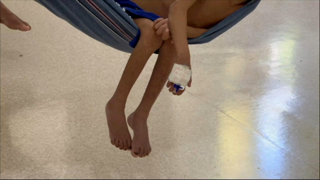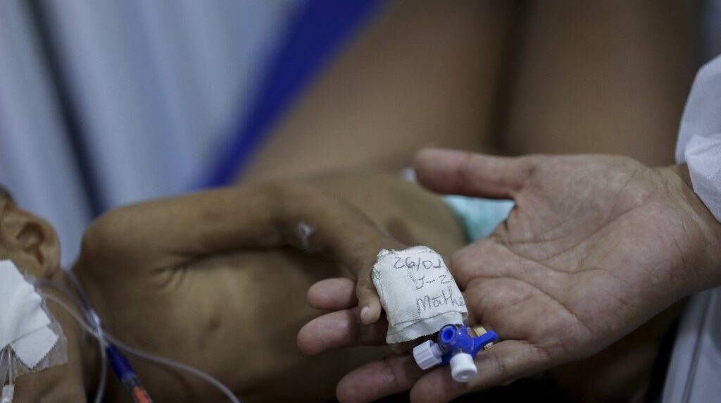 En el hospital infantil San Antonio de Boa Vista, en el estado de Roraima (norte), un puñado de niños cuelgan, semidesnudos, en hamacas azules, sus brazos y piernas enflaquecidos. Uno tiene la mano vendada.