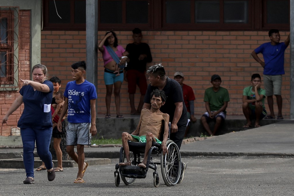 Un indígena yanomami desnutrido es transportado en silla de ruedas al Hospital de Campo de la Fuerza Aérea Brasileña. Foto: Michael Dantas / STR / AFP)