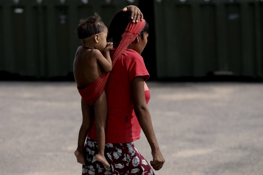 Una mujer indígena yanomami lleva a su hijo a la espalda en el Hospital de Campo de la Fuerza Aérea Brasileña construido dentro de la Casa de Salud Indígena en la ciudad de Boa Vista, estado de Roraima, Brasil. Foto: Michael Dantas/ STR / AFP