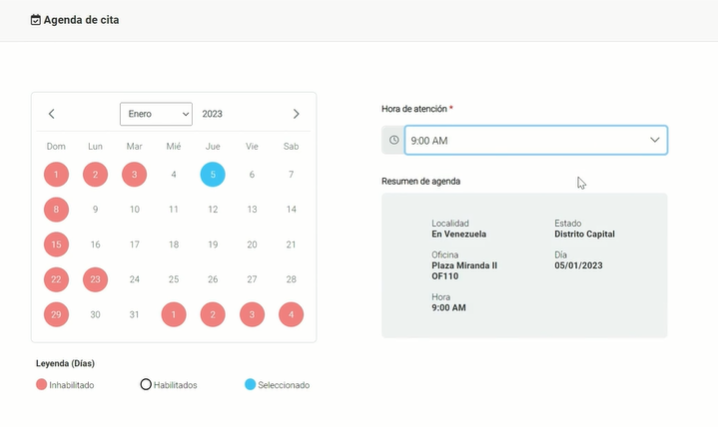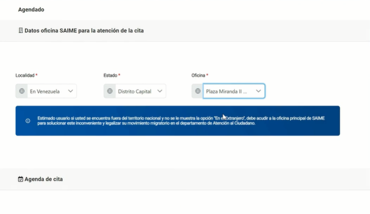 Posterior al registro de datos, el sistema mostrará la sección de agendado, donde el usuario podrá seleccionar la oficina Saime donde desea sea atendida su cita. El sistema desplegará los días disponibles para agendar la cita en la oficina seleccionada. El usuario deberá seleccionar el día y hora disponible.