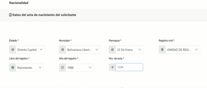 El sistema mostrará el formulario de registro de datos de nacionalidad y el usuario deberá registrar los datos del acta de nacimiento y además los datos del centro de salud en el que nació.