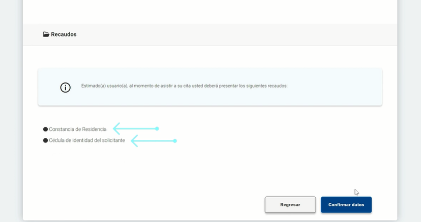 Por último el usuario mostrará en la sección inferior de la sección de revisión de orden los recaudos que el solicitante deberá llevar al momento de ir a la cita. Para la solicitud de pasaporte adulto se necesita constancia de residencia y cédula del solicitante.